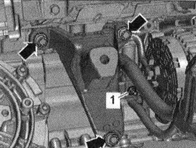 Снять правую подушку двигателя. Открутить гайку «1» и высвободить провод массы на кронштейне опоры двигателя. Выкрутить болты «стрелки» и снять правую опору двигателя.