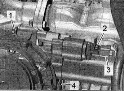 Отсоединить эл. штекерное соединение «3», для этого отодвинуть предохранитель назад и нажать рычаг разблокировки вниз. Отсоединить эл. провод «2» от генератора. Выкрутить болт «1» с задним удлинителем с КП. Выкрутить болт «4» и снять стартер.