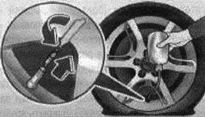 Относится к а/м: с колпачками. Перед отворачиванием колесных болтов необходимо снять колпачки. Надвинуть входящий в комплект инструмента пластмассовый зажим на колпачок. При этом внутренние фиксаторы зажима должны защелкнуться в бурте колпачка. Снять колпачок входящим в комплект инструмента пластмассовым зажимом.