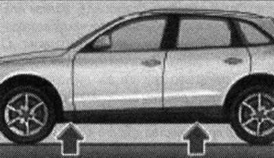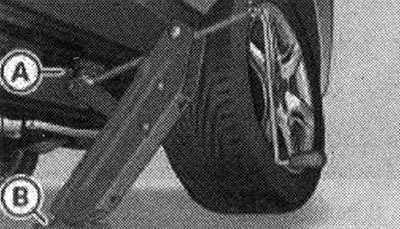 Для демонтажа колеса необходимо поднять а/м домкратом. На нижнем лонжероне кувова найти ближайшее к неисправному колесу гнездо установки домкрата. Вращать рукоятку расположенного под гнездом домкрата и вывести его подъемную лапу на такую высоту, чтобы она находилась непосредственно под вертикальным ребром лонжерона. Выровнять домкрат так, чтобы кулачковый подхват подъемной лапы «А» охватывал ребро лонжерона, а подвижная пята «В» упиралась всей поверхностью в основание. Вращением рукоятки домкрата поднять а/м до отрыва неисправного колеса от земли. Устанавливать домкрат разрешается только в показанных местах. Для каждого колеса предусмотрено только одно гнездо. Установка домкрата в других местах запрещается. Если а/м установлен на нестабильной поверхности, он может соскользнуть с домкрата. Поэтому устанавливать домкрат на прочную опорную поверхность. При необходимости установить под пяту домкрата широкую, прочную опору. На скользкой поверхности (например, облицовочной плитке) подложить под домкрат нескользящую подстилку (например, резиновый коврик).