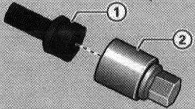 Для поворачивания запирающихся колесных болтов требуется специальный адаптер. Ввести входящий в комплект инструмента проволочный захват в отверстие декоративного колпака. Потянуть и снять декоративный колпак. Вставить адаптер «2» до упора в запирающийся болт колеса «1». Установить баллонный ключ до упора на адаптер «2». Ослабить/затянуть болт колеса. Рекомендуется всегда возить в а/м адаптер для запирающегося колесного болта. Хранить адаптер вместе с комплектом инструмента. На торце адаптера выбит номер кода блокировки колесного болта. На предприятии Audi на основании данного номера кода при необходимости можно изготовить дубликат.