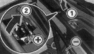 Завести двигатель токоотдающего а/м «В» и оставить его работать на холостом ходу. Запустить двигатель с разряженным АКБ «А». Если двигатель не заводится: прекратить попытку запуска через 10 секунд и повторить процесс запуска спустя 30 секунд. Когда двигатель заведется, отсоединить оба кабеля, действуя строго в обратной последовательности. Закрыть крышку «2» положительного полюса и установить крышку «1». Аккумулятор а/м оснащен системой наружной вентиляции. Образующийся в аккумуляторе газ тем самым удаляется из а/м. Следить за достаточным металлическим контактом подключенных полюсных зажимов.