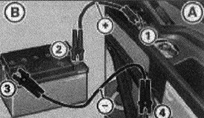 Запуск двигателя от АКБ другого а/м: А -разряженный АКБ, В - токоотдающий АКБ