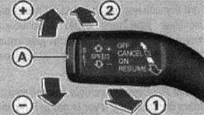 Система регулировки скорости дает возможность поддерживать заданную скорость, начиная с 30 км/ч. Для включения устройства потянуть рукоятку в положение «1». Двигаться с актуальной скоростью, которую требуется поддерживать. Для программирования скорости нажать кнопку «А». На дисплее появится запрограммированная скорость и зеленая контрольная лампочка