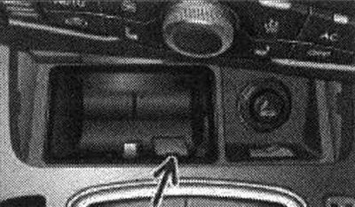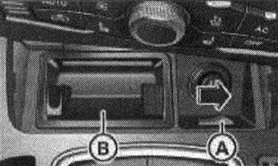 В случае прекращения электропитания рычаг переключения передач можно деблокировать механически. Чтобы получит доступ к устройству аварийной деблокировки, необходимо снять вставной элемент пепельницы «В» с помощью деблокировочной рукоятки «А». Ослабить и удалить небольшую крышку из гнезда крепления пепельницы. Отверткой или другим схожим предметом нажать на болт и удерживать его нажатым. В заключение нажать кнопку блокировки и установить рычаг переключения передач в положение «N». Рычаг переключения передач можно переместить из положения «Р», только если ключ находится в замке зажигания и включено зажигание. Если в случае прекращения электропитания (например, разряжен АКБ) а/м необходимо толкать или буксировать, следует с помощью приспособления для аварийной деблокировки рычага переключения передач установить рычаг в положение «N».