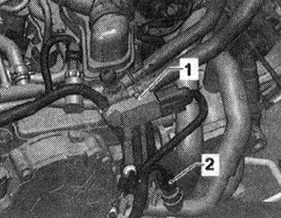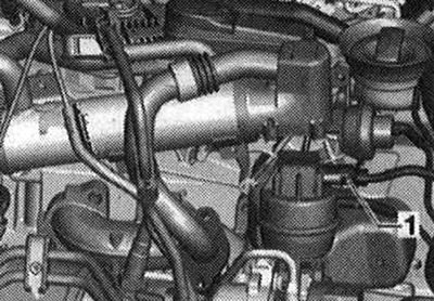 Детали 1. Разъём датчика температуры ОГ 1 «G235»; 2. Переключающий клапан радиатора системы рециркуляции ОГ «N345»