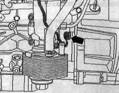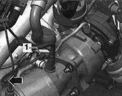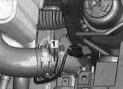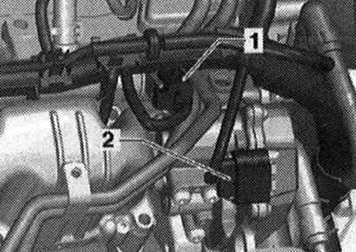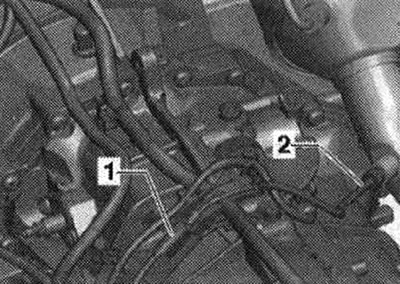 Детали и узлы на задней части двигателя 1. Датчик 1 давления ОГ «G450»; 2. Датчик температуры ОЖ на выходе из радиатора «G83»