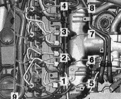Форсунки и свечи накаливания 1. Форсунка цилиндра 1 «N30»; 2. Форсунка цилиндра 2 «N31»; 3. Форсунка цилиндра 3 «N32»; 4. Форсунка цилиндра 4 «N33»; 5. Свеча накаливания 1 «Q10»; 6. Свеча накаливания 2 «Q11»; 7. Свеча накаливания 3 «Q12»; 8. Свеча накаливания 4 «Q13»; 9. Патрубки обратных топливопроводов