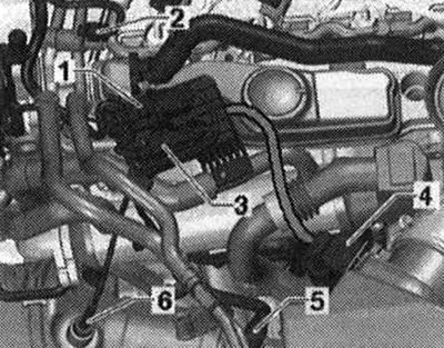 Детали 1. Разъём лямбда-зонда «G39» с нагревательным элементом лямбда-зонда «Z19»; 2. Датчик температуры топлива «G81»; 3. Разъём датчика температуры ОГ 3 «G495»; 4. Расходомер воздуха «G70»; 5. Лямбда-зонд «G39» с нагревательным элементом лямбда-зонда «Z19»; 6. Датчик температуры ОГ 3 «G495»