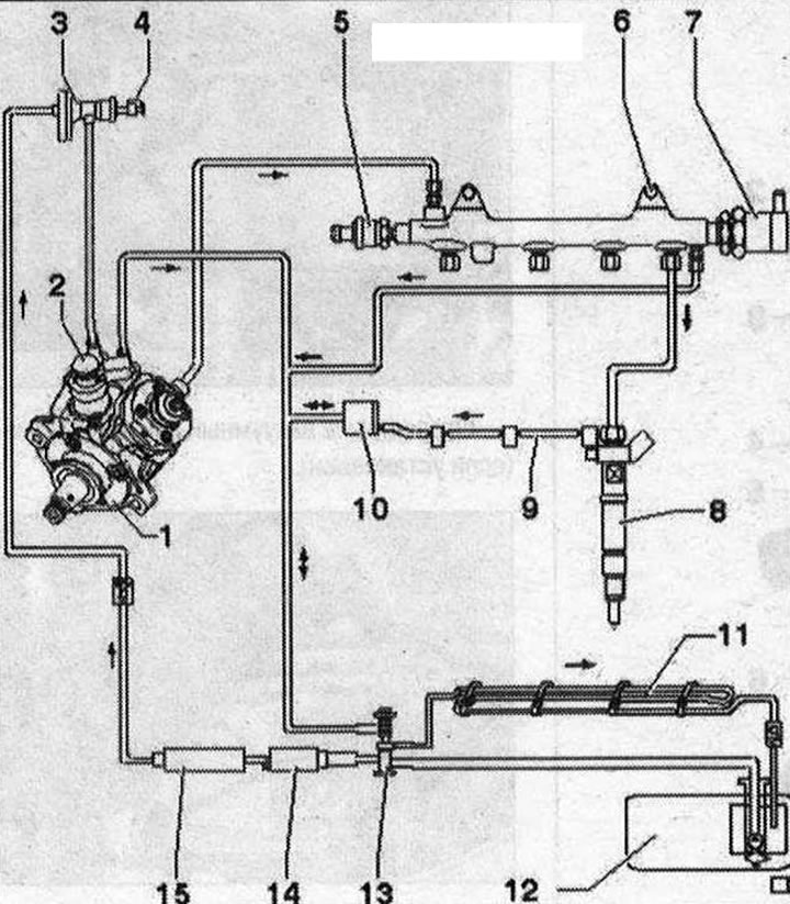 Схема системы 1. Насос высокого давления (ТНВД), после замены "необходимо" заполнить топливом (необходимо предотвратить работу в режиме сухого трения); 2. Клапан дозирования топлива «N₂90», не открывать; 3. Сетчатый фильтр; 4. Датчик температуры топлива «G81»; 5. Датчик давления топлива «G247», 100 Н·м; 6. Топливная рампа; 7. Регулятор давления топлива «N₂75», 80 Н·м, не использовать повторно; 8. Форсунки; 9. Обратные топливопроводы, обратные топливопроводы разбирать нельзя, замена возможна только в сборе с редукционным клапаном, после замены необходимо дать двигателю поработать на холостом ходу около 2 минут,чтобы удалить воздух из топл. системы, после чего проверить обратные топливопроводы на герметичность 10. Редукционный клапан, задача редукционного клапана поддерживать остаточное давление в обратных топливопроводах на уровне 10 бар. Это необходимо для нормальной работы форсунок, редукционный клапан разрешается заменять только в сборе с обратными топливопроводами, после замены необходимо дать двигателю поработать на холостом ходу около 2 минут, чтобы удалить воздух из системы питания; 11. Топливный радиатор, установлен на днище; 12. Топливный бак, с подкачивающим топл. насосом «G6»; 13. Клапан подогрева топлива; 14. Дополнительный топл. насос «V393»; 15. Топливный фильтр