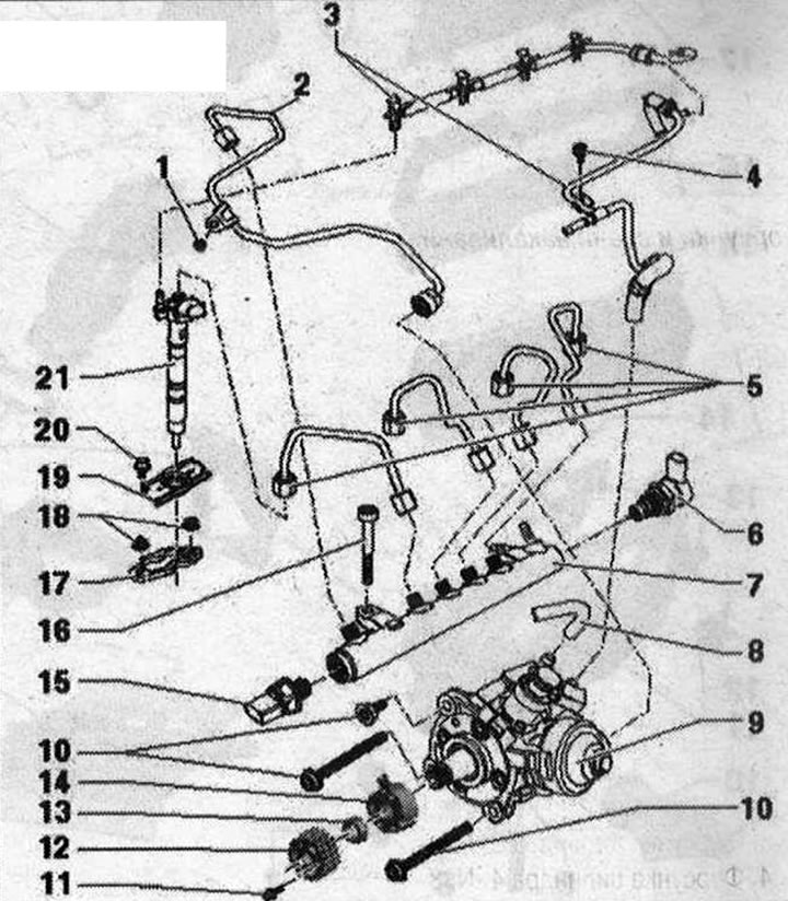 Детали и узлы системы питания 1. Болт, 10 Н·м; 2. Трубопровод высокого давления, 25 Н·м, между насосом высокого давления и топл. рампой; 3. Обратные топливопроводы, к топливному баку, обратный топливопровод нельзя перегибать, нельзя допускать его повреждения или засорения, обратные топливопроводы разбирать нельзя, замена возможна только в сборе с редукционным клапаном, задача редукционного клапана поддерживать в обратных трубопроводах остаточное давление (регулируемое количество) на уровне 10 бар. Это необходимо для нормальной работы форсунок, после замены необходимо дать двигателю поработать на холостом ходу около 2 минут, чтобы удалить воздух из топл. системы, после чего проверить обратные топливопроводы на герметичность; 4. Болт, 10 Н·м; 5. Трубопроводы высокого давления, 25 Н·м, между топл. рампой (АКБ давления) и форсунками, не менять местами, устанавливать без напряжений; 6. Регулятор давления топлива «N₂76», 80 Н·м, не использовать повторно; 7. Топливная рампа; 8. Напорная топл. магистраль; 9. Насос высокого давления (ТНВД), с клапаном дозирования топлива «N₂90» (не открывать), после замены необходимо заполнить топливом (необходимо предотвратить работу в режиме сухого трения); 10. Болт, 20 Н·м, длинные болты довернуть на 180°, короткие болты довернуть на 90°; 11. Болт, 20 Н·м; 12. Зубчатый шкив ТНВД; 13. Гайка, 95 Н·м; 14. Ступица, с задающим ротором, при ослаблении и затягивании использовать упор «Т10051», для снятия использовать съёмник «Т40064»; 15. Датчик давления топлива «G247», 100 Н·м; 16. Болт, 22 Н·м; 17. Прижимная пластина. Устанавливаемые повторно форсунки и прижимные пластины должны быть обязательно установлены в тот же цилиндр. Если форсунка заменяется новой, необходимо заменять и прижимную пластину; 18. Шестигранная гайка с буртиком, для прижимной пластины, 10 Н·м; 19. Крышка форсунки; 20. Болт, 5 Н·м; 21. Форсунка