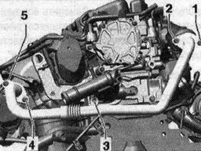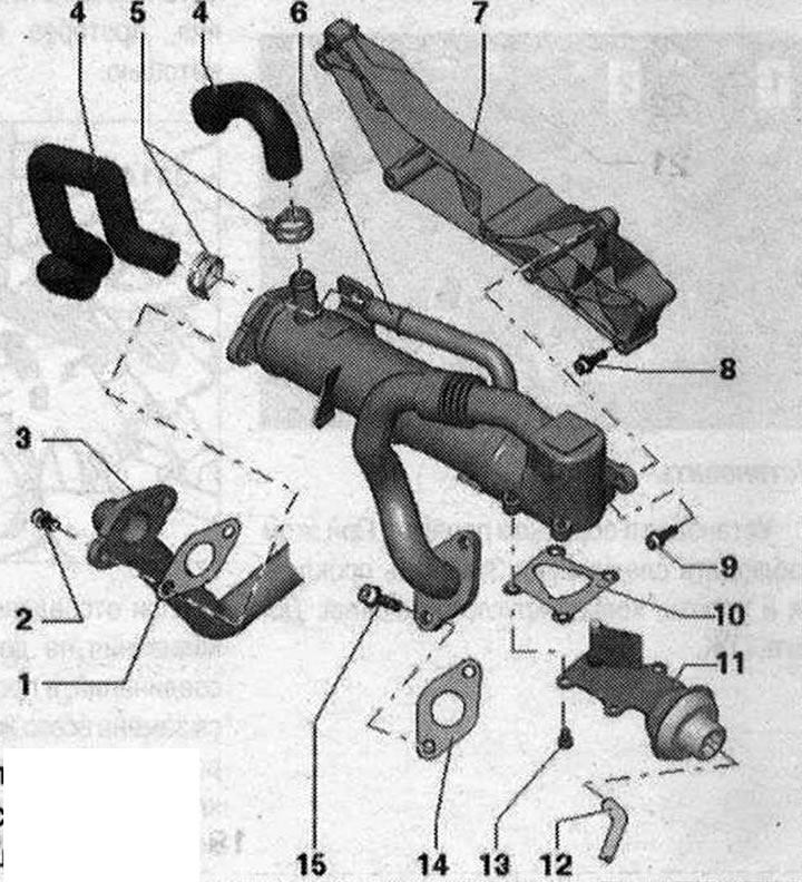 Детали и узлы системы рециркуляции ОГ 1. Прокладка, заменить; 2. Болт; 3. Соединительная трубка системы рециркуляции ОГ; 4. Водяные шланги; 5. Пружинный хомут; 6. Радиатор системы рециркуляции ОГ; 7. Держатель; 8/9. Болт, 9 Н·м; 10. Прокладка; 11. Вакуумный резервуар; 12. Вакуумный шланг, от переключающего клапана радиатора системы рециркуляции ОГ «N345»; 13. Болт, 7 Н·м; 14. Прокладка, заменить; 15. Болт, 25 Н·м, заменить