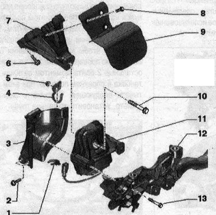 Опора агрегатов 1. Держатель штекерного разъема; 2. Болт, 20 Н·м; 3. Крепёжная пластина, для подушки двигателя, при замене опоры двигателя также заменить; 4. Держатель для гидромагистрали; 5. Гайка, 9 Н·м; 6. Болт, 40 Н·м; 7. Опора двигателя; 8. Болт, 10 Н·м; 9. Теплоизоляция; 10. Болт, заменить, 90 Н·м + 90°; 11. Подушка двигателя, с эл. магн. клапаном левой электрогидравлической опоры двигателя «N144» (только слева), заменять попарно слева и справа; 12. Подрамник; 13. Болт, 55 Н·м