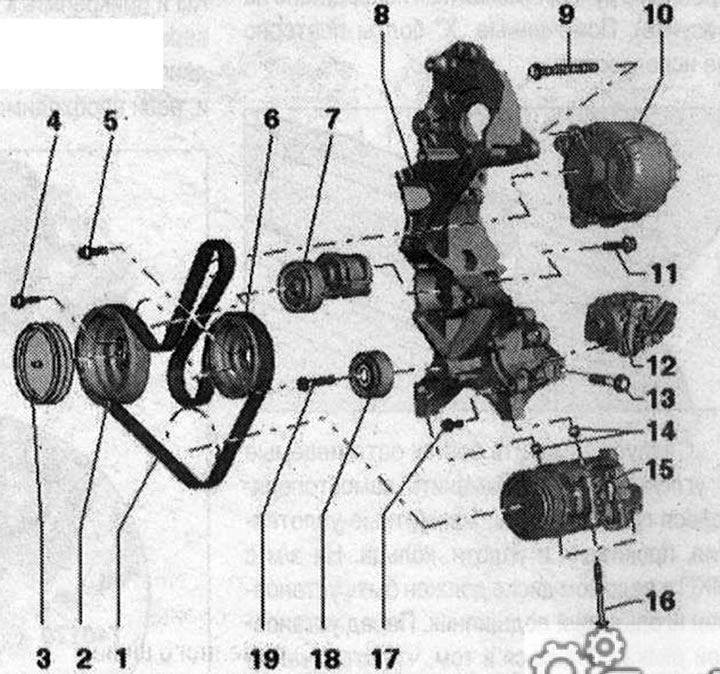 Поликлиновой привод 1. Поликлиновой ремень, проверить степень износа, перед снятием пометить направление хода мелом или фломастером. Изменение направления хода ранее эксплуатировавшегося ремня может привести к его повреждению, при установке следить за правильным положением на шкивах.; 2. Ременной шкив / демпфер крутильных колебаний, установка возможна только в одном положении; 3. Крышка гасителя крутильных колебаний; 4. Болт, 10 Н·м + 90°, заменить; 5. Болт; 6. Ременный шкив лопастного насоса; 7. Натяжной элемент поликлинового ремня; 8. Кронштейн доп. агрегатов; 9. Болт; 10. Трехфазный генератор; 11. Болт, 20 Н·м+ 180°; 12. Лопастной насос; 13. Болт, заменить; 14. Установочная втулка, следить за правильным расположением в держателе; 15. Компрессор климатической установки, не отворачивать/не отсоединять магистрали хладагента, при установке следить за положением установочных втулок; 16/17. Болт; 18. Обводной ролик поликлинового ремня, учитывать положение установки; 19. Болт, 20 Н·м + 90°