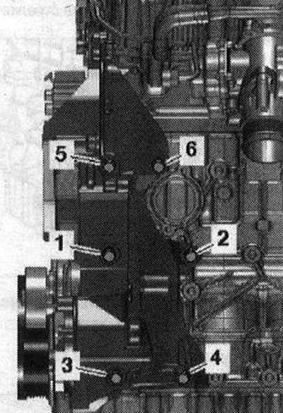 Заменить болты кронштейна вспомогательных агрегатов и установить их следующим образом: Болты «1, 5, 6» М10х60. Болт «2» М10х40. Болты «3, 4» М10x155. Затянуть болты кронштейн вспомогательных агрегатов в последовательности в 5 этапа следующим образом: