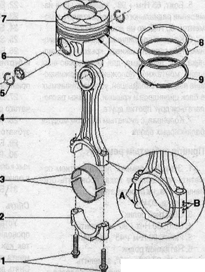 Поршни и шатуны 1. Болт, заменить, смазать маслом резьбу и поверхность прилегания, 30 Н·м + 90°, для измерения радиального биения затянуть старые болты моментом 30 Н·м, но не доворачивать; 2. Крышка шатуна, благодаря выполненным методом конструктивного разлома (крекинг) шатунам крышка шатуна устанавливаются только в одном положении и только на соответствующий шатун, отметить соответствие цилиндру цветным карандашом «В», монтажное положение: метки «А» должны быть обращены в сторону шкивов; 3. Вкладыш подшипника, маркировать ранее эксплуатировавшиеся вкладыши, но не на рабочей поверхности, верхний и нижний вкладыши не взаимозаменяемы: верхний (обращенный в сторону поршня) выполнен из более износостойкого материала. Отличительный признак нового вкладыша: чёрная линия на рабочей поверхности в области разделения, проверить надёжность крепления, предельная величина осевого люфта: 0,37 мм; 4. Шатун, заменять только весь комплект, с надломанной крышкой шатунного подшипника, отметить соответствие цилиндру цветным карандашом «В», монтажное положение: метки «А» должны быть обращены в сторону шкива (к носку коленвала); 5. Стопорное кольцо, заменить; 6. Поршневой палец, если палец входит с трудом, разогреть поршень до 60°C; 7. Поршень, с камерой сгорания, изображение не соответствует исполнению в а/м. Пометить монтажное положение и принадлежность к цилиндру; 8. Поршневые кольца, компрессионные кольца, разместить замки со смещением на 120°, монтажное положение: при установке маркировка "ТОР", или сторона с надписью должна быть обращена к днищу поршня; 9. Поршневое кольцо, маслосъемное кольцо, сместить стык на 120° к нижнему компрессионному кольцу