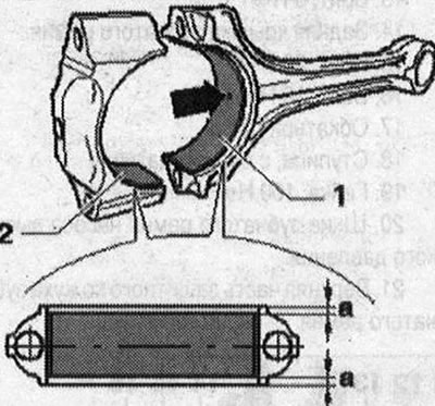 Установить вкладыши подшипников в шатун или крышку подшипника шатуна по центру. Размер «а» слева = размеру «а» справа.