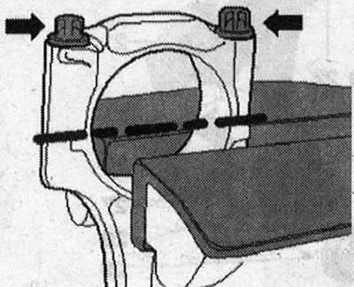 Может оказаться, что излом новых шатунов в месте принудительного излома осуществлен не полностью. Если крышка подшипника шатуна нё снимается от руки, выполнить следующее: Для предотвращения повреждений необходимо легко зажать шатун в тисках с защитными губками, как показано на рис. Зажать шатун под штрих «лини» ей. Выкрутить болты «стрелки» примерно на 5 оборотов. Пластиковой киянкой осторожно ударить по крышке подшипника шатуна «стрелка», пока та не ослабнет.