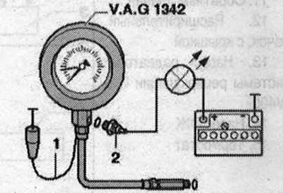 Условия проверки: Уровень масла в норме, проверить. Температура масла минимум 80°C (вентилятор системы охлаждения должен сработать минимум 1 раз). Снять датчик давления масла «F1». Подключить манометр к отверстию для датчика давления масла. Вкрутить датчик давления масла «поз. 2» в отверстие в манометре. Подключить коричневый провод «1» манометра к "массе" (-). Подключить тестер напряжения «V.A.G 1527В» при помощи вспомогательных проводов из набора вспомогательных измерительных средств «V.A.G 1594С» к датчику давления масла «F1» и положительному выводу АКБ (+). Светодиод тестера не должен светиться.