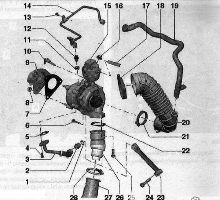 Турбонагнетатель 1. Манжетное уплотнение, заменить; 2. Соединительный патрубок, 40 Н·м; 3. Обратный маслопровод, к блоку цилиндров, накидную гайку затянуть с моментом 20 Н·м; 4. Болт, 15 Н·м, болты класса прочности 10.9; 5. Прокладка, заменить; 6. Болт, 20 Н·м; 7. Прокладка, заменить; 8. Гайка, 23 Н·м, заменить; 9. Сажевый фильтр с катализатором; 10. Датчик 1 температуры ОГ «G235»; 11. Манжетное уплотнение, заменить; 12. Соединительный патрубок, 30 Н·м; 13. Болт, 10 Н·м; 14. Подающий маслопровод, затянуть накидные гайки с моментом 22 Н·м; 15. Турбонагнетатель; 16. Гайка, 25 Н·м, болтового соединения турбонагнетателя к выпускному коллектору, заменить, смазать термостойкой пастой; 17. Вакуумный шланг, электромагнитный клапан ограничения давления турбонаддува «N75»; 18. Хомут шланга, 3,5 Н·м; 19. Шланг вентиляции картера двигателя; 20. Шланг воздуховода; 21. Хомут шланга, 3,5 Н·м; 22. Прокладка, замена при повреждении или негерметичности; 23. Опора; 24. Болт, 40 Н·м; 25. Болт, 10 Н·м; 26. Патрубок; 27. Воздуховод к интеркулеру; 28. Хомут шланга, 3,5 Н·м