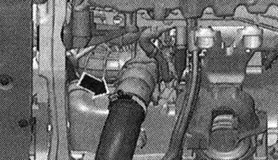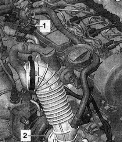 Если турбонагнетатель имеет механические повреждения (например повреждение крыльчатки), недостаточно просто заменить турбонагнетатель. Для предотвращения последующих повреждений необходимо произвести следующие работы: Проверить корпус и фильтрующий элемент возд. фильтра, а также шланги подачи воздуха на наличие загрязнений. Проверить всю систему подачи наддувочного воздуха и интеркулер на наличие посторонних предметов. Если в системе наддува воздуха обнаружены посторонние тела, прочистить магистрали подачи наддувочного воздуха и при необходимости заменить интеркулер. Снять кожух двигателя «стрелки». Снять корпус возд. фильтра. Отвести и высвободить вентиляцию картера двигателя. Ослабить зажим для шланга «2», снять и извлечь воздуховодный шланг. Снять шумоизоляцию. Снять выхлопную трубу.