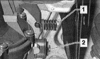 Отсоединить болтовое соединение «1», выкрутить болт «2» и извлечь подвесное крепление сажевого фильтра.