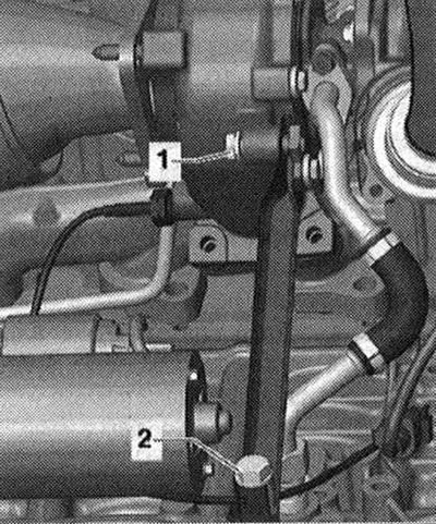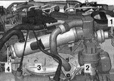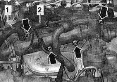 Магистрали «1» и «2» не откручивать. Открутить болты «стрелки» и подвязать охладитель системы рециркуляции ОГ.