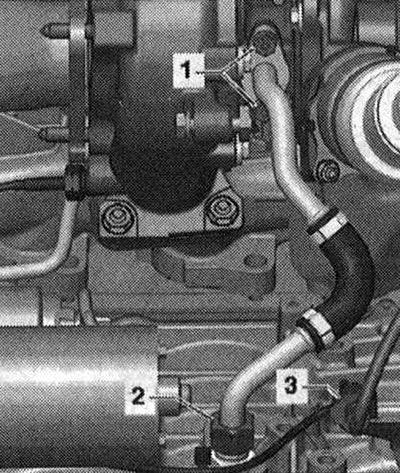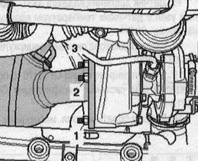 Выкрутить гайки «1...3» на турбонагнетателе. В а/м с автономным отопителем гайка «1» доступна снизу.