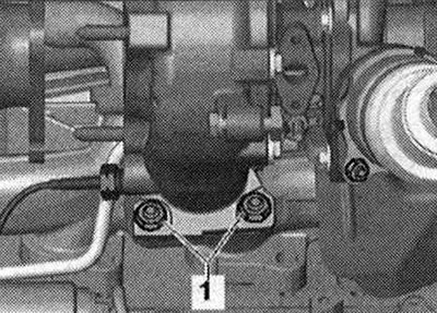 Выкрутить гайки «1» и извлечь турбонагнетатель. Во избежание попадания грязи закрыть открытые магистрали и патрубки на турбонагнетателе чистыми заглушками или защитными колпачками. Во избежание повреждений снятый турбонагнетатель запрещается ставить на верхнюю часть обратной масляной магистрали.