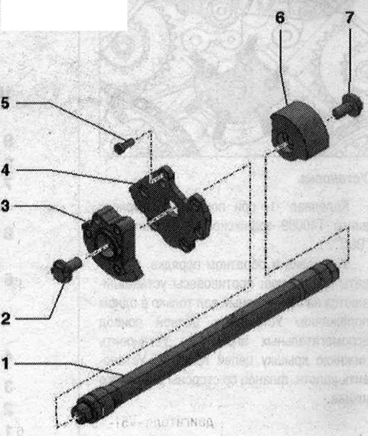 Балансирный вал 1. Балансирный вал; 2. Болт. 60 Н·м. Для откручивания и затяжки в качестве контропоры использовать сверло диаметром 8 мм; 3. Противовес со стороны КП. Устанавливается на балансирный вал только в одном положении; 4. Корпус опоры; 5. Болт. 13 Н·м; 6. Балансир со стороны ременного шкива. Устанавливается на балансирный вал только в одном положении; 7. Болт. 60 Н·м. Для откручивания и затяжки в качестве контропоры использовать сверло 8 мм