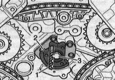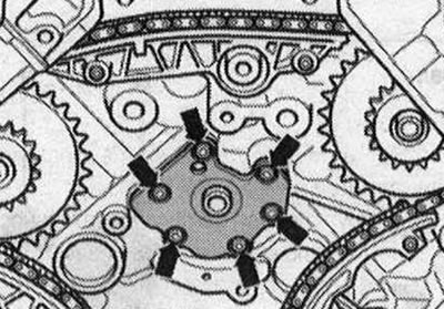 Отвернуть болты «стрелки» и снять опорный щит балансирного вала. Вынуть балансирный вал из блока цилиндров назад.