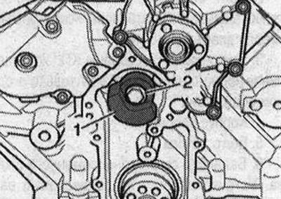 Выкрутить болт «2», удерживая противовес пробойником, и снять передний противовес «1» на двигателе с балансирного вала.