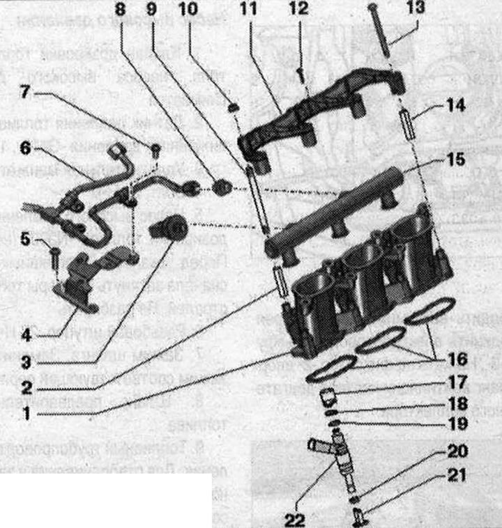 Нижняя часть впускного коллектора с топл. рампой 1. Нижняя часть впускного коллектора; 2. Втулка; 3. Датчик давления топлива «G247», 20 Н·м; 4. Кронштейн; 5/7/13. Болт, 9 Н·м; 6. Магистраль высокого давления. Не изменять гнутую форму. Ни в коем случае не сгибать держатель топл. магистрали. Если держатель был согнут или топл. магистраль подлежит замене, то необходимо заменить и держатель; 8. Резьбовой штуцер, 40 Н·м; 9. Болт со штифтом; 10. Гайка, 9 Н·м; 11. Хомут распределителя топлива; 12. Болт, 2,5 Н·м; 14. Втулка; 15. Топливная рампа; 16. Прокладки. Заменить; 17. Опорное кольцо. Проверить правильность посадки. Через это опорное кольцо топл. рампа передает усилие, которое удерживает форсунку в ГБЦ; 18. Уплотн. кольцо. Заменить. Смазать чистым маслом; 19. Распорное кольцо. При повреждении заменить; 20. Уплотн. кольцо камеры сгорания. Заменить; 21. Радиальный компенсатор. При повреждении заменить, приклипсовать к опорному кольцу «поз. 17»; 22. Форсунку