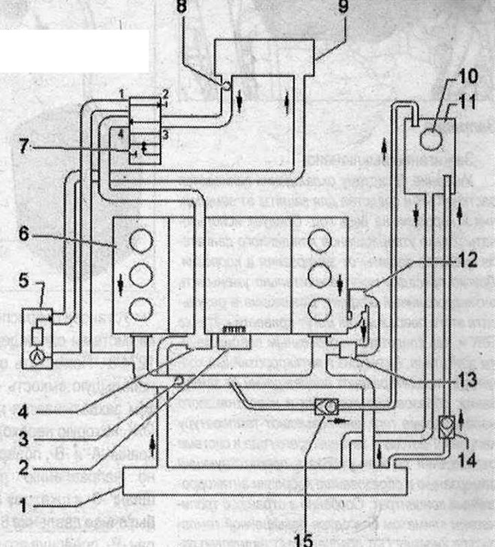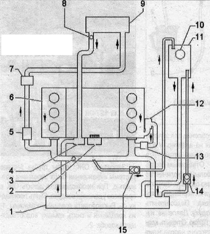 А/м без автономного отопителя Стрелки показывают направление потока ОЖ. 1. Радиатор. После замены сменить ОЖ; 2. Насос ОЖ; 3. Датчик температуры ОЖ «G62»; 4. Термостат; 5. Насос циркуляции ОЖ «V50». Управляется от реле циркуляционного насоса «J160»; 6. ГБЦ и блок цилиндров. После замены сменить ОЖ; 7. Запорный клапан ОЖ. Управляется через запорный клапан ОЖ Climatronic «N422». Запорный клапан ОЖ Climatronic «N422» управляется б/у Climatronic «J255»; 8. Вентиляционное отверстие; 9. Теплообменник отопителя. После замены сменить ОЖ; 10. Крышка расшир. бачка; 11. Расширительный бачок; 12. Радиатор масла. После замены сменить ОЖ; 13. Насос системы прокачки ОЖ после выключения двигателя «V51» (только на а/м для эксплуатации в жарких странах); 14/15. Обратный клапан