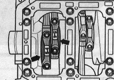 Монтажное положение: больший заплечик шатунов «стрелки» обращен к прилегающему главному подшипнику. На рисунке изображена передняя шатунная пара.