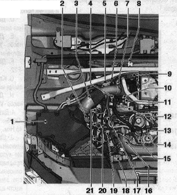 Правая сторона мот. отсека 1. Клапан байпасной заслонки возд. фильтра «N₂75» : узлы (байпасная заслонка с клапаном байпасной заслонки возд. фильтра «N₂75») устанавливаются не во всех вариантах компл. и не для всех стран; если байпасная заслонка установлена, то она расположена в корпусе возд. фильтра, и клапан байпасной заслонки возд. фильтра «N₂75» закреплен снаружи на корпусе возд. фильтра; 2. Расходомер воздуха «G70»; 3. Датчик Холла «G40» (датчик положения распредвала); 4. Регулировочный клапан давления топлива «N₂76»; 5. Датчик давления 1 для ОГ «G450» : после замены необходимо провести адаптацию; 6. Электрическое штекерное соединение: датчика температуры ОГ 4 «G648»; 7. Датчик температуры ОЖ «G62»; 8. Датчик 4 температуры ОГ «G648»; 9. Б/у турбонагнетателя 1 «J724»; 10. Разъем датчика температуры в системе рециркуляции ОГ «G98»; 11. Эл. разъем датчика температуры ОГ 1 «G235» : датчик температуры ОГ 1 «G235»; 12. Двигатель заслонки впускного коллектора «V157» : ряд цилиндров 1; 13. Патрубок топл. магистрали контура высокого давления; 14. Топливный насос высокого давления: с клапаном дозировки топлива «N₂90»; после замены ТНВД "необходимо" провести первую заправку топливом (для исключения работы всухую); 15. Клапан дозировки топлива «N₂90» : не открывать; установлен непосредственно в топл. насосе высокого давления; 16. Датчик давления масла для пониженного давления «F378»; 17. Датчик температуры топлива «G81»; 18. Насос радиатора системы рециркуляции ОГ «V400»; 19. Датчик температуры ОЖ на выходе радиатора «G83»; 20. Редукционный клапан: в дренажных трубопроводах 1 и 2 ряда цилиндров; функция редукционного клапана, обеспечивать остаточное давление в возвратных топл. магистралях (объем управления) прибл. 10 бар; это количество необходимо для работы пьезоинжекторов; редукционный клапан заменять только в комплекте с возвратными топливными магистралями; после замены дать двигателю поработать прибл. 2 минуты на холостом ходу для удаления воздуха из топл. системы; 21. Форсунки (пьезоинжекторы): ряд цилиндров 1