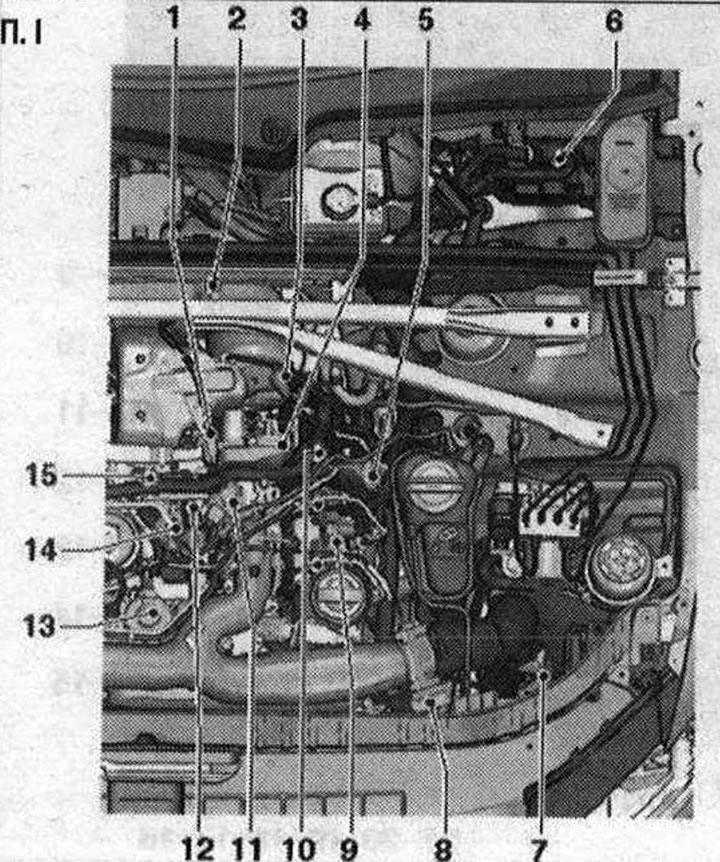 П. I 1. Штекерный разъём датчика 3 температуры ОГ «G495»; 2. Датчик 3 температуры ОГ «G495» : установлен за каталитическим нейтрализатором; 45 Н·м; 3. Лямбда-зонд «G39» с нагревом для лямбда-зонда «Z19» : 50 Н·м; 4. Двигатель заслонки впускного коллектора 2 «V275» : ряд цилиндров 2; 5. Штекерный разъём лямбда-зонда «G39»; 6. Б/у двигателем «J623»; 7. Датчик давления наддува «G31» : с датчиком температуры всасываемого воздуха «G42»; 8. Б/у дроссельной заслонкой «J338» : 9 Н·м; 9. Датчик давления топлива «G247» : 30 Н·м; 10. Форсунки (пьезоинжекторы): ряд цилиндров 2; 11. Переключающий клапан радиатора системы рециркуляции ОГ «N345»; 12. Датчик температуры в системе рециркуляции ОГ «GOS»; IS. Топливный насос высокого давления: с клапаном дозировки топлива «N₂90»; после замены ТНВД "необходимо" провести первую заправку топливом (для исключения работы всухую); 14. Серводвигатель системы рециркуляции ОГ «V338»; 15. Вакуумный регулятор: заслонки переключения от радиатора системы рециркуляции ОГ; А. Реле малой мощности обогрева «J359» и реле большой мощности обогрева «J360»; В. Датчик сигнала торможения «F» и Датчик положения педали ножного тормоза «F47» : в пространстве для ног на педали тормоза; С. Датчик положения педали газа «G79» и датчик положения педали газа 2 «G185»; D. Датчик частоты вращения двигателя «G28»; Е. Дополнительный топл. насос «V393» : под правым защитным экраном днища; F. Датчик давления масла «F22»; G. Клапан регулировки давления масла «N428»; Н. Дополнительный топл. насос «V393»; I. Датчик температуры ОГ 1 «G235» : на турбокомпрессоре; 45 Н·м; J. Сажевый фильтр: установлен снизу снаружи на днище кузова а/м; общий узел с предварительно соединенным основным катализатором; после замены необходимо провести адаптацию