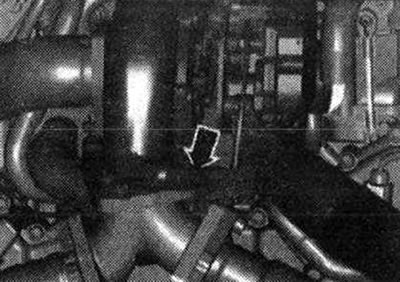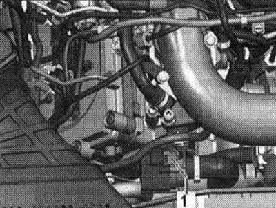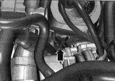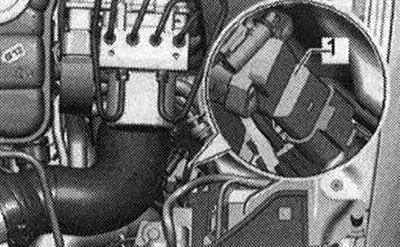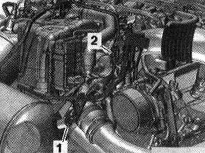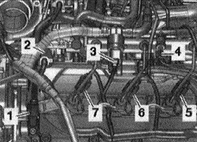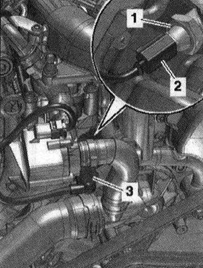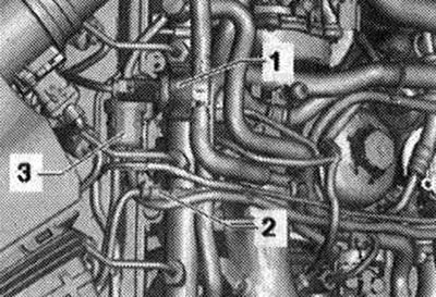 Детали правого ряда цилиндров 1. Датчик температуры топлива «G81»; 2. Датчик температуры ОЖ на выходе радиатора «G83»; 3. Поддерживающий клапан противотока топлива