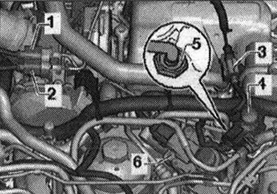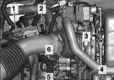 Места установки 1. Эл. разъем датчика температуры в системе рециркуляции ОГ «G98»; 2. Эл. разъем датчика температуры ОГ 1 «G235»; 3. Эл. разъем датчика температуры ОГ 3 «G495»; 4. Переключающий клапан радиатора системы рециркуляции ОГ «N345»; 5. Датчик температуры в системе рециркуляции ОГ «G98»; 6. Серводвигатель системы рециркуляции ОГ «V338»