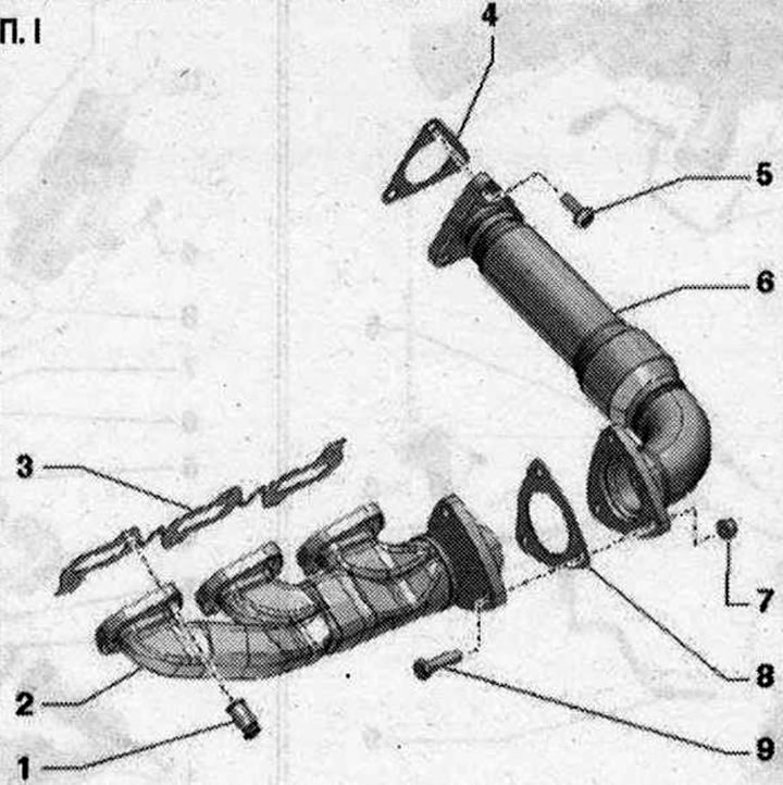 П. I 1. Гайка: заменить; смазать термостойкой пастой; термостойкая паста; 25 Н·м; 2. Выпускной коллектор; 3/4/8. Прокладка: заменить; 5. Болт: заменить; смазать термостойкой пастой; термостойкая паста; 30 Н·м + 90°; 6. Промежуточная трубка; 7. Гайка: заменить; 30 Н·м + 90°; 9. Болт: заменить; смазать термостойкой пастой; термостойкая паста