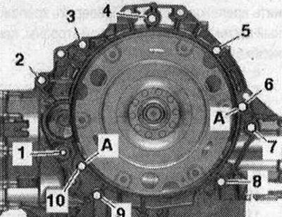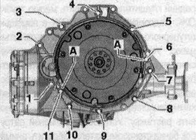 А/м с МКП: Проверить наличие в блоке цилиндров центровочных втулок «А» двигателя и КП, при необходимости вставить втулки. Установить КП на двигатель и затянуть болты «2...5».