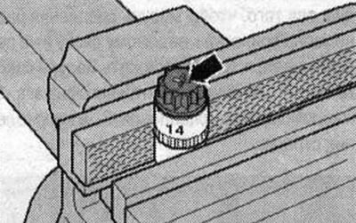 Алюминиевые болты можно использовать дважды. Поэтому после первого использования пометить резцом такие болты двумя насечками "Х" «стрелка». Для того чтобы при насечке не повредить болты, не следует закреплять их в тисках. Вставить болт, как показано на рисунке, в торцевую головку на 14 с помощью 1/2-привода, которую затем можно закрепить в тисках. Помеченные "X" болты повторно не использовать.