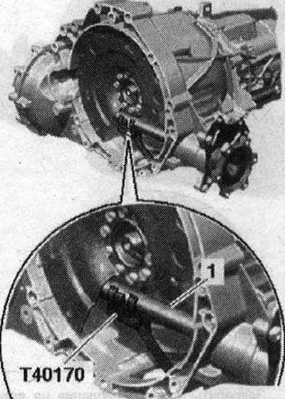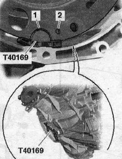 Непременно очистить резьбовые отверстия для фиксации силового агрегата в блоке цилиндров перед сборкой КП метчиком. Перед соединением двигателя и КП провести следующие подготовительные действия: установить монтажное приспособление «Т40169» снизу под картер КП и двухмассовый маховик, как показано на рисунке. Монтажное приспособление должно входить в полукруглый паз «1» и дополнительно в контрольное отверстие «2».