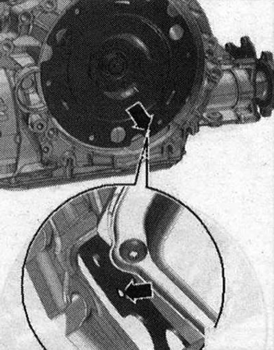 А/м с МКП: Следующий шаг необходим для того, чтобы модуль сцепления равномерно прилегал к ведомому диску и не перекашивался. Установить передние колеса. 4-ю передачу включить и вращать передние колеса в направлении движения до тех пор, пока модуль сцепления не сделает полный оборот. Контрольное отверстие «стрелка» должно быть снова видно в углублении корпуса КП.