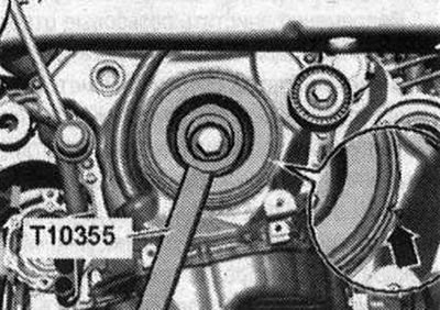 Закрепить модуль сцепления на ведомом диске следующим образом: первый болт «стрелка» вкрутить вручную (2 Н·м). Провернуть далее коленвал за маховик с помощью контропоры «Т10355» на 240° в направлении вращения двигателя.