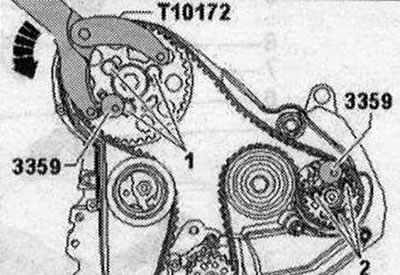 Удалить стопорный штифт насоса системы непосредственного впрыска диз. двигателя «3359» и стопор коленвала «Т10050». Провернуть коленвал за болт зубчатого ремня на 2 оборота в направлении вращения двигателя так, чтобы коленвал снова оказался недалеко от "ВМТ". Повторить контроль фаз ГРМ. Если ступицу распредвала теперь можно зафиксировать, довернуть болты «1» шестерни зубчатого ремня распредвала с заданным моментом. Довернуть болты «2» шестерни зубчатого ремня насоса высокого давления с заданным моментом. Повторить контроль фаз ГРМ.