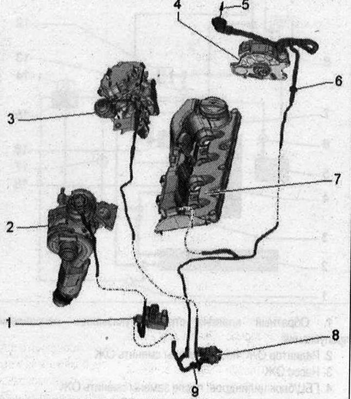 Схема соединений вакуумных шлангов 1. Эл. магн. клапан ограничения давления наддува «N75»; 2. Турбонагнетатель: с вакуумным резервуаром; с датчиком положения регулятора давления наддува «G581»; 3. Вакуумный резервуар переключающего клапана радиатора системы рециркуляции ОГ; 4. Вакуумный насос; 5. К усилителю тормозного привода; 6. Обратный клапан: устанавливать в надлежащем положении; 7. Крышка ГБЦ: с вакуумным ресивером; 8. Переключающий клапан радиатора системы рециркуляции ОГ «N345»; 9. Обратный клапан: устанавливать в надлежащем положении