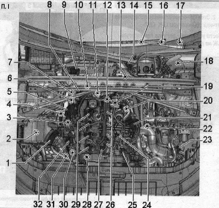Место установки системы впрыска. I 1. Расходомер воздуха «G70»; 2. Клапан байпасной заслонки возд. фильтра «N₂75» : вариант для национального рынка; 3. Штекерные разъемы: для лямбда-зонда «G39»; для датчика температуры ОГ 3 «G495»; 4. Лямбда-зонд «G39» с нагревательным элементом лямбда-зонда «Z19»; 5. Исполн. электродвигатель системы рециркуляции ОГ «V338» с потенциометром системы рециркуляции ОГ «G212» : встроен в радиатор системы рециркуляции ОГ; 6. Датчик 3 температуры ОГ «G495»; 7. Датчик температуры ОЖ на выходе радиатора «G83»; 8. Датчик разности давлений «G505»; 9. Насос циркуляции ОЖ «V50» : только а/м с системой запуск-остановка; 10. Датчик 4 температуры ОГ «G648» 11. Датчик температуры ОЖ «G62»; 12. Регулировочный клапан давления топлива «N₂76»; 13. Датчик нейтрального положения КП «G701» : только а/м с системой запуск-остановка; 14. Датчик давления усилителя тормозов «G294»; 15. Датчик положения педали газа «G79» и датчик положения педали газа 2 «G185»; 16. Выключатель стоп «сигнала-F» и датчик на педали тормоза «F47»; 17. Датчик положения педали сцепления «G476» : с датчиком положения педали сцепления для пуска двигателя «F194» и датчиком положения педали сцепления «F36» (только в а/м с МКП); только в а/м с МКП; 18. Б/у двигателя «J623»; 19. Датчик количества оборотов двигателя «G28»; 20. Насос радиатора системы рециркуляции ОГ «V400»; 21. Модуль управления дроссельной заслонки «J338» с потенциометром дроссельной заслонки «G69»; 22. Левый электромагнитный клапан электрогидравлической опоры двигателя «N144» : только слева; 23. Датчик давления наддува «G31» /датчик температуры всасываемого воздуха «G42»; 24. Датчик температуры топлива «G81»; 25. Клапан дозировки топлива «N₂90»; 26. Свечи накаливания: Свеча накаливания 1 «Q10». Свеча накаливания 2 «Q11». Свеча накаливания 3 «Q12». Свеча накаливания 4 «Q13»; 27. Датчик давления топлива «G247»; 28. Датчик Холла «G40»; 29. Форсунки: Форсунка цилиндра 1 «N30». Форсунка цилиндра 2 «N31». Форсунка цилиндра 3 «N32». Форсунка цилиндра 4 «N33»; 30. Эл. магн. клапан ограничения давления наддува «N75»; 31. Переключающий клапан радиатора системы рециркуляции ОГ «N345»; 32. Позиционный датчик регулятора давления наддува «G581»