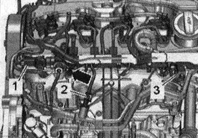 Места установки 1. Датчик давления топлива «G247»; 2. Датчик температуры топлива «G81»; 3. Регулировочный клапан давления топлива «N₂76»