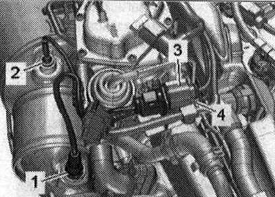 Места установки 1. Лямбда-зонд «G39»; 2. Датчик 3 температуры ОГ «G495»; 3. Электрическое штекерное соединение лямбда-зонда «G39»; 4. Электрическое штекерное соединение датчика 3 температуры ОГ «G495»